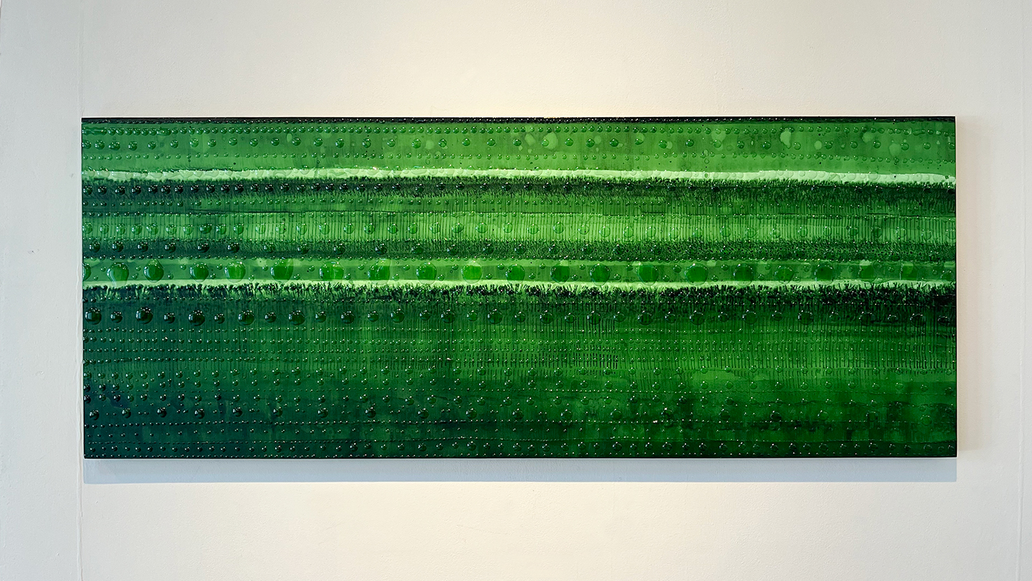 モノクロームで表現されたミクストメディアの絵画の空間には、作品が持つ力強さでエネルギーが宿っています。