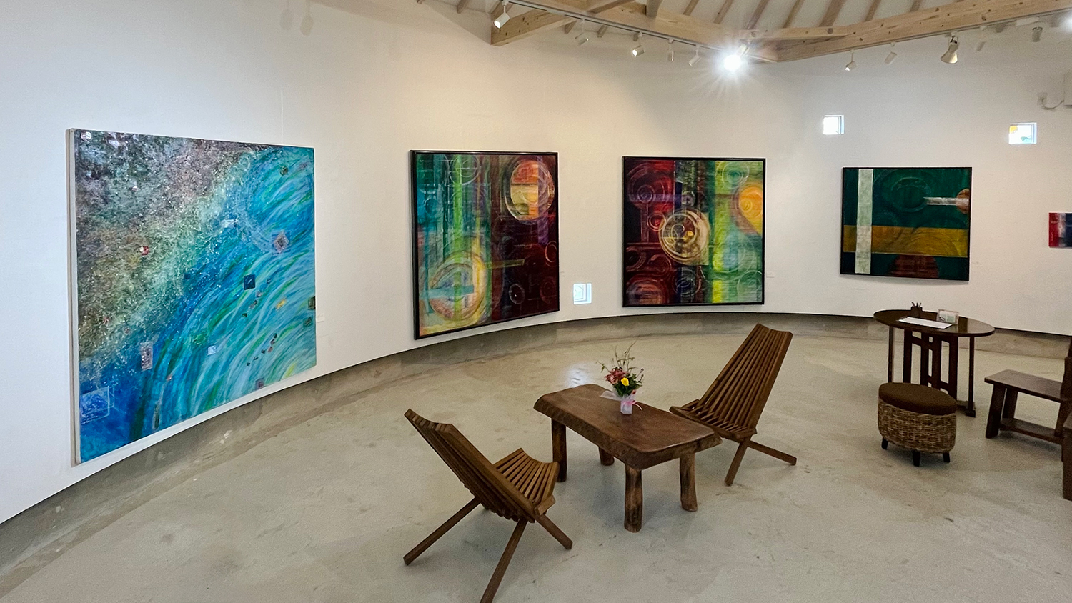油絵、水彩画、石彫、ミクストメディアの作品が並びます。